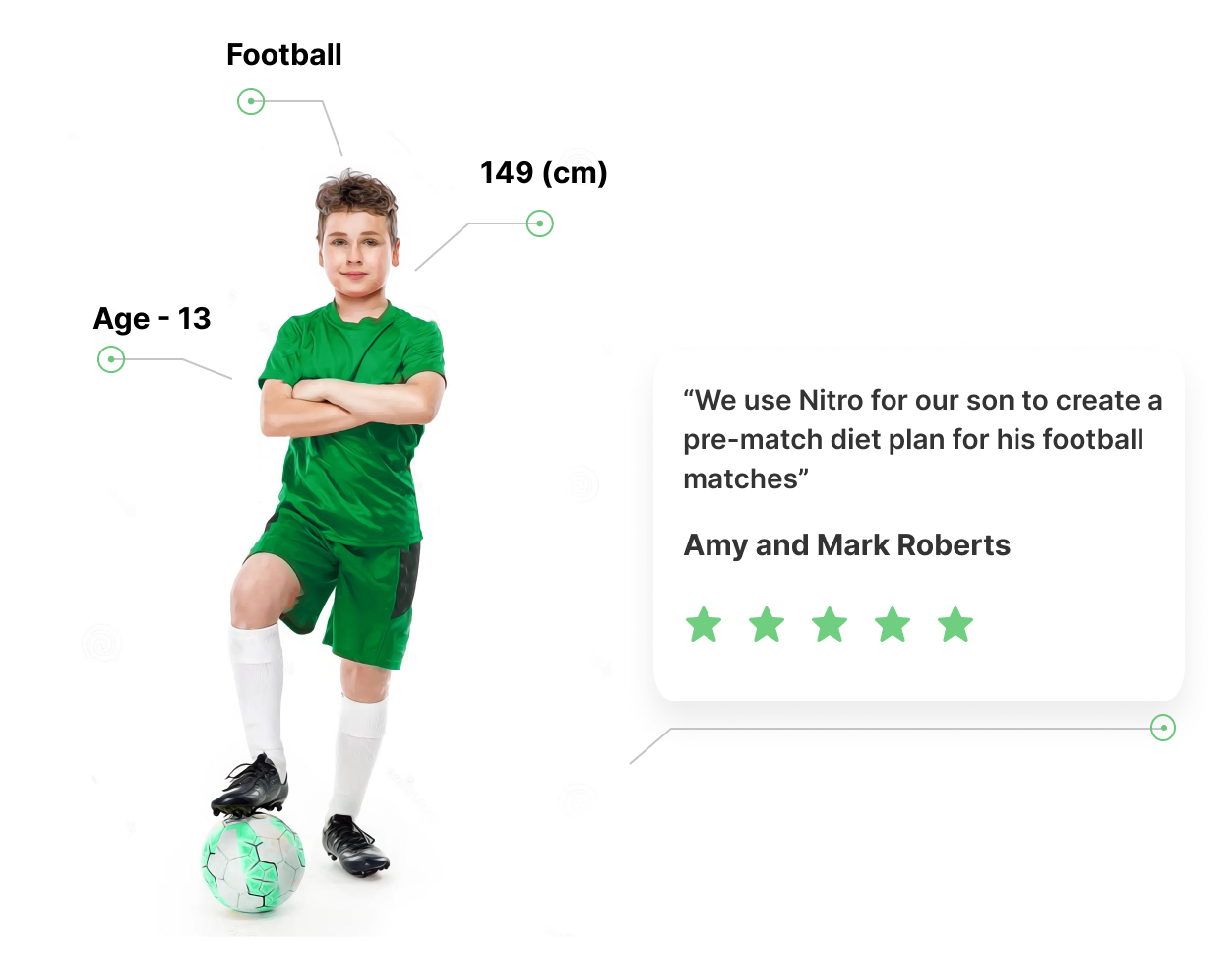Nitro's technology calculates how much energy a particular position in a sport expends. with some formula magic it connects your metrics with your sport and position and gives you a specific meal plan which will give you the energy required fon competition day.